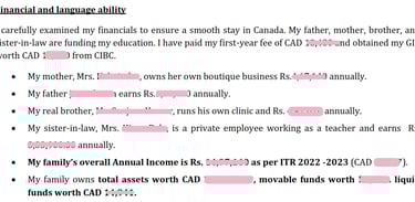 Example: "My family's overall annual income is Rs. 14,86,490 as per ITR 2024-2025. We own total assets worth CAD 50,000, including movable and liquid funds."