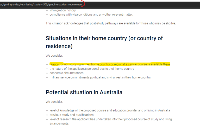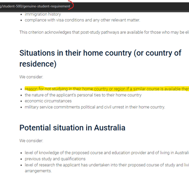 Official guidelines of the Australian Embassy asking to justify local options for GTE (https://immi.homeaffairs.gov.au/visas/getting-a-visa/visa-listing/student-500/genuine-student-requirement)