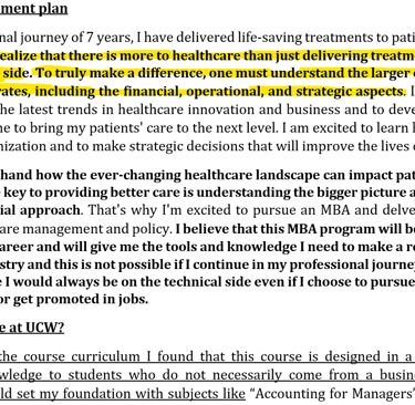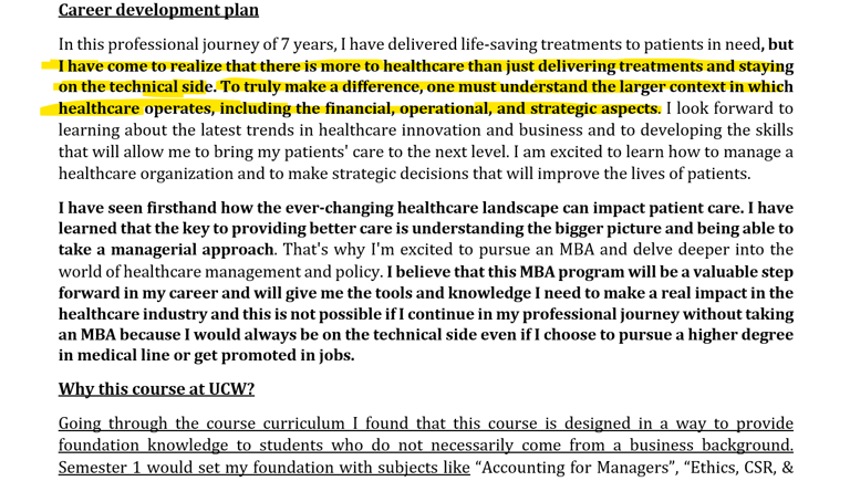 Align Course with Career Goals: Clearly explain how the chosen course directly aligns with your career aspirations, showing a logical progression from your previous studies or job roles. Example: "Having completed my bachelor's in business, this MBA will provide the necessary skills to advance to a managerial role."