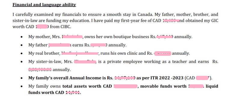 Show Comprehensive Financial Stability: Provide detailed information on your family's overall income and assets to demonstrate financial stability. For instance, "Our family's annual income is Rs. 14,86,490, with total assets worth CAD 50,000, ensuring sufficient funds for my education."