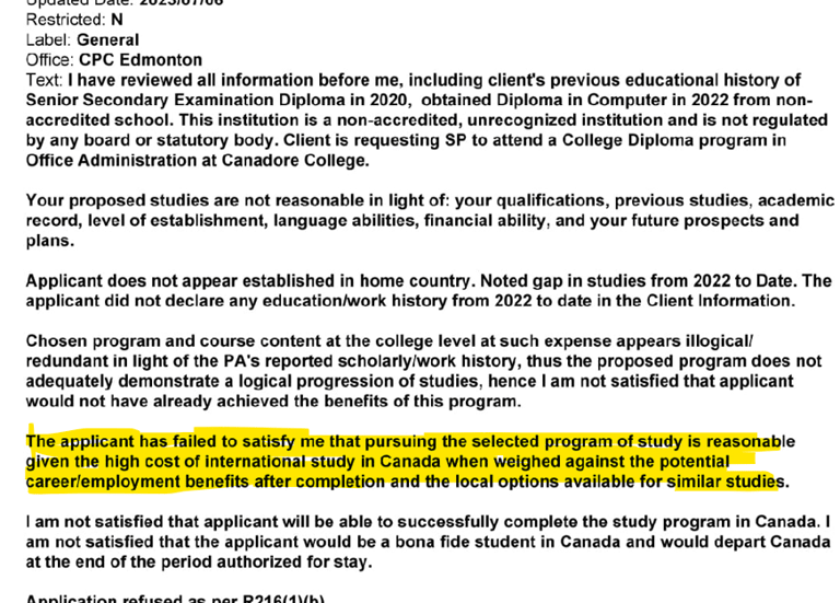 (How Canadian Embassy refuses, if student does not justifies why he is not choosing local options)
